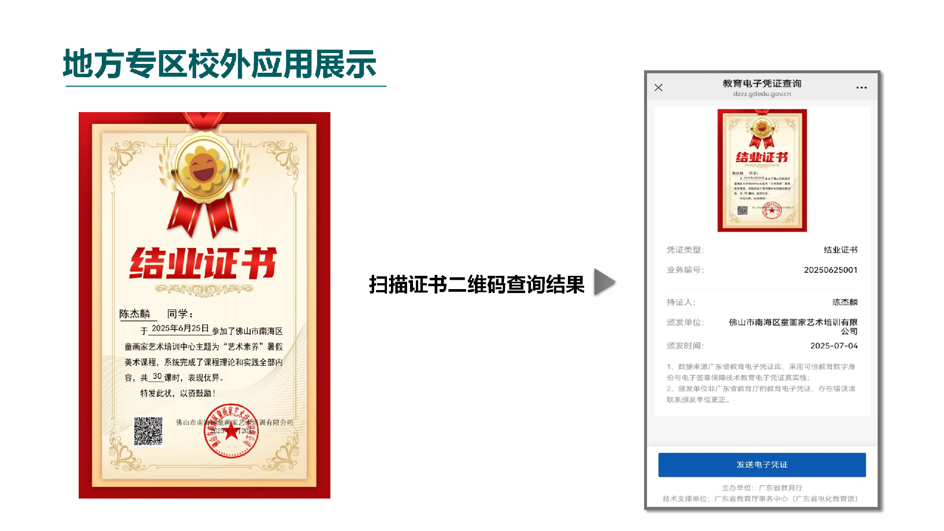 2、提升机构公信力:机构通过可信教育数字凭证服务系统发放的电子证书可以在教育部、广东省教育厅、粤省事等政府/政务平台查询和验证,增加机构证书的公信力,彰显机构专业性和规范性,提升机构在行业内的竞争力和声誉。